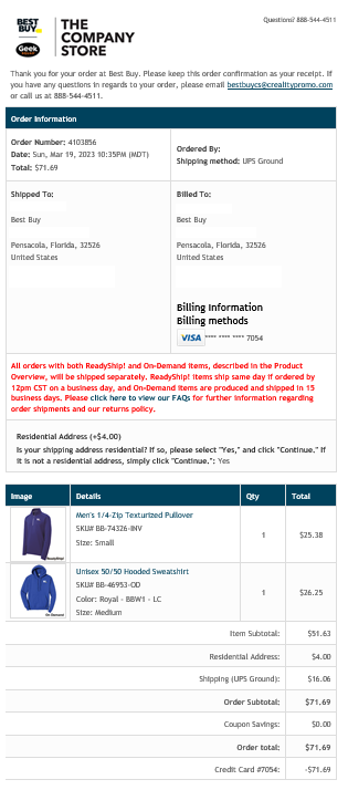 - Once you click "Place Order Now," your order will be submitted. You'll be taken to a screen that provides you with your order number, and you'll receive an emailed Order Confirmation from BBYCompanyStore.com with your order details. Please keep this for your records, as this also serves as your receipt. Once you've submitted your order, changes cannot be made.
