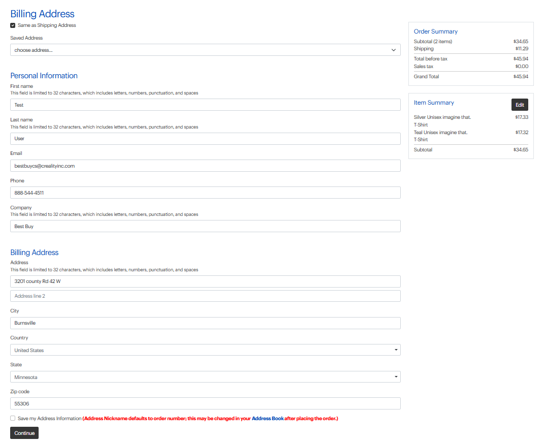 - When completing your payment information, make sure that the billing address entered matches the address that the statements for the card you will be using are sent. We accept American Express, Discover, MasterCard and Visa. If you have a saved address from a previous order, you may use it here from the top dropdown. If your billing address is the same as the shipping address, you may simply click "Same as Shipping Address" at the top. If you'd like to save this billing address, please check the "Save my Address Information" box at the bottom before clicking continue (NOTE: The nickname for the address will default to the order number after placing the order. You may change this nickname in your Address Book after you have placed your order).