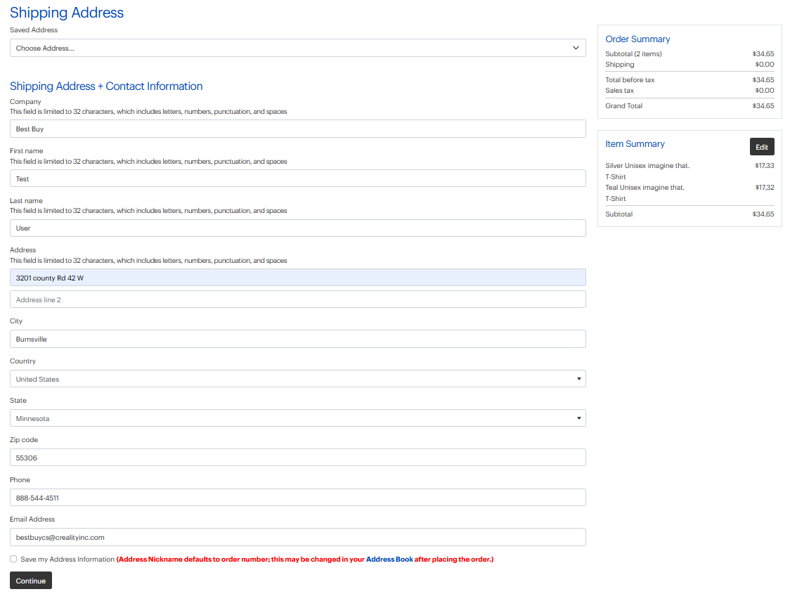 - Enter your shipping address within the Shipping Address section. Please note we do not deliver to PO Box addresses, so please provide us with a physical street address. If you have a saved address from a previous order, you may use it here from the top dropdown. If you'd like to save this shipping address, please check the "Save my Address Information" box at the bottom before clicking continue (NOTE: The nickname for the address will default to the order number after placing the order. You may change this nickname in your Address Book after you have placed your order).