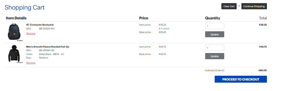 - When in the shopping cart, you have the option to "Continue Shopping" - which brings you back to the home page, "Clear Cart" - empties your cart, or "Proceed to Checkout," to complete your order.